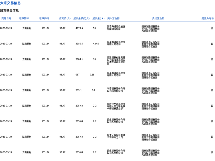 3月20日,江南新材大宗交易成交142万股,成交额1.33亿元,占当日总成交额的39.62%,成交价93.47元,较市场收盘价100.5元折价7%。