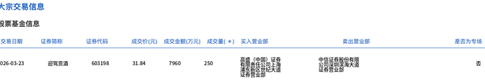3月23日,迎驾贡酒大宗交易成交250万股,成交额7960万元,占当日总成交额的33.91%,成交价31.84元,较市场收盘价31.84元持平。