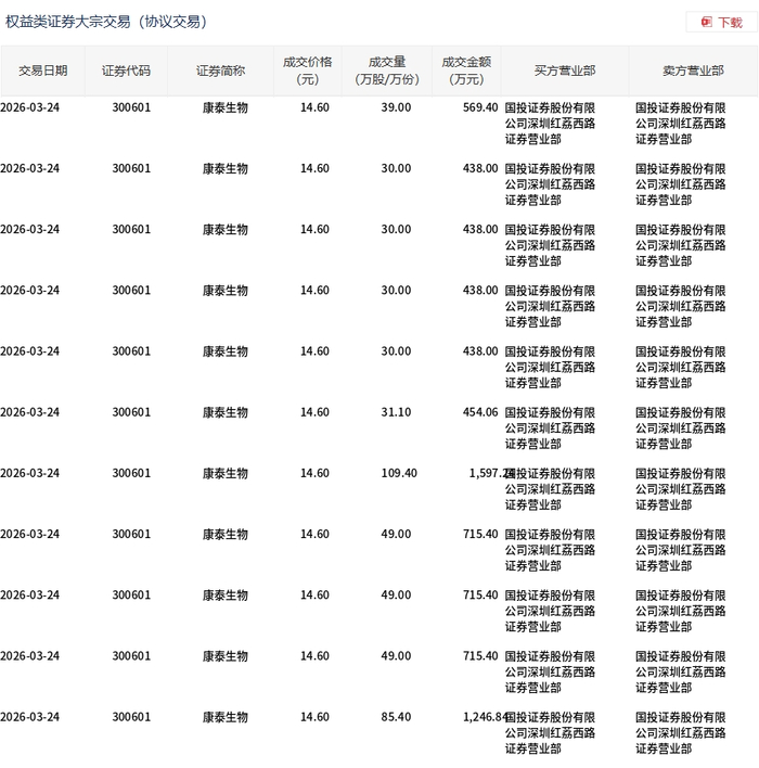 3月24日,康泰生物大宗交易成交531.9万股,成交额7765.74万元,占当日总成交额的34.37%,成交价14.6元,较市场收盘价13.66元溢价6.88%。