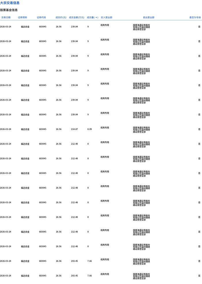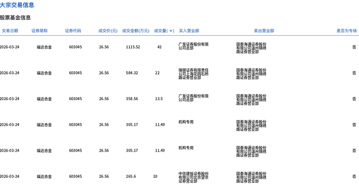 3月24日,福达合金大宗交易成交260.89万股,成交额6929.23万元,占当日总成交额的37.16%,成交价26.56元,较市场收盘价29.78元折价10.81%。