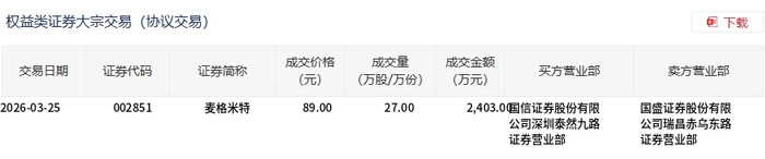 3月25日,麦格米特大宗交易成交27万股,成交额2403万元,占当日总成交额的1.4%,成交价89元,较市场收盘价103.1元折价13.68%。