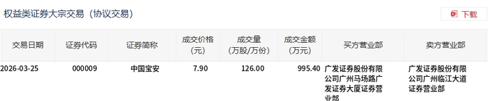 中国宝安今日大宗交易折价成交126万股,成交额995.4万元