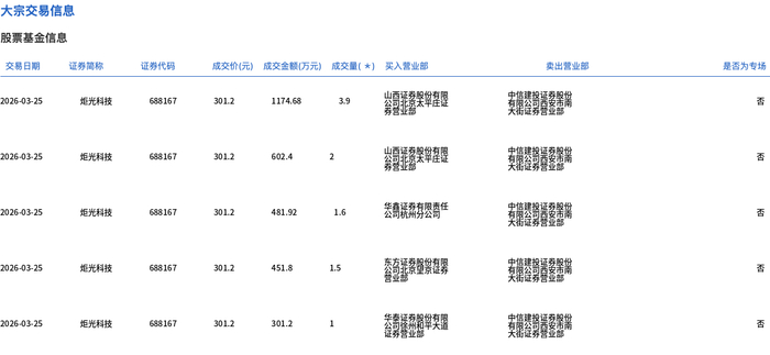 3月25日,炬光科技大宗交易成交10万股,成交额3012万元,占当日总成交额的1.13%,成交价301.2元,较市场收盘价332.49元折价9.41%。