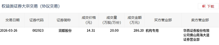 润都股份今日大宗交易折价成交20万股,成交额286.2万元