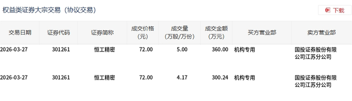 3月27日,恒工精密大宗交易成交9.17万股,成交额660.24万元,占当日总成交额的7.79%,成交价72元,较市场收盘价78.06元折价7.76%。
