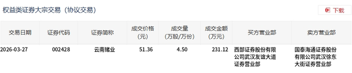 云南锗业今日大宗交易平价成交4.5万股,成交额231.12万元