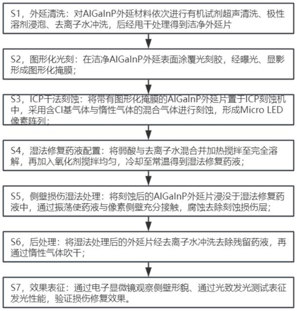 该专利包括以下步骤:S1,外延清洗;S2,图形化光刻;S3,ICP干法刻蚀;S4,S4,湿法修复药液配置;S5,侧壁损伤湿法处理;S6,后处理;S7,效果表征;本申请针对ICP干法刻蚀产生50100nm侧壁损伤层、引发非辐射复合致器件效率低,且现有ALE/ALD技术成本高或修复不彻底的问题,提出清洗图形化光刻ICP刻蚀弱酸+氧化剂湿法修复后处理表征的工艺;修复后损伤层去除率≥90%,光致发光峰值提升≥25%,无需专用设备,兼容Micro LED量产流程,降低成本,适用于AR/VR全彩显示等场景,有效提升器件发光性能。