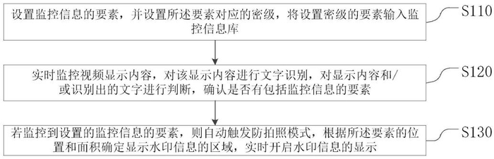 该发明所述方法包括:设置监控信息的要素,并设置所述要素对应的密级,将设置密级的要素输入监控信息库;实时监控视频显示内容,对该显示内容进行文字识别,对显示内容和/或识别出的文字进行判断,确认是否有包括监控信息的要素;若监控到设置的监控信息的要素,则自动触发防拍照模式,根据所述要素的位置和面积确定显示水印信息的区域,实时开启水印信息的显示。