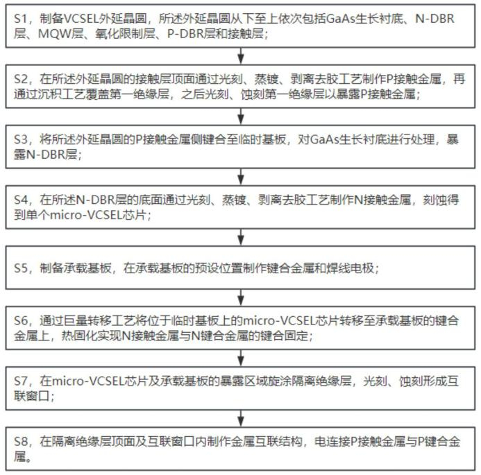 其结构包括承载基板、microVCSEL芯片、隔离绝缘层及金属互联结构;承载基板选自Si复合、绝缘复合、TGV或绝缘透明基板,通过巨量转移将microVCSEL芯片固定于基板键合金属上,利用隔离绝缘层窗口与金属互联结构实现电极从外延结构向低成本基板的转移;方法包括外延晶圆制备、芯片微型化、巨量转移、绝缘层制作及金属互联成型等步骤,支持垂直/倒装芯片、P侧/N侧发光,适配多场景需求。