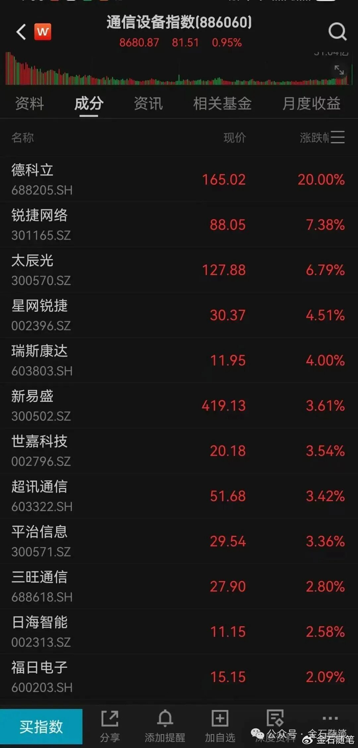 就在今日,算力股继续走高,德科立20cm涨停,锐捷网络和太辰光等大涨超6%,中际旭创再度暴涨6%,股价突破600元。