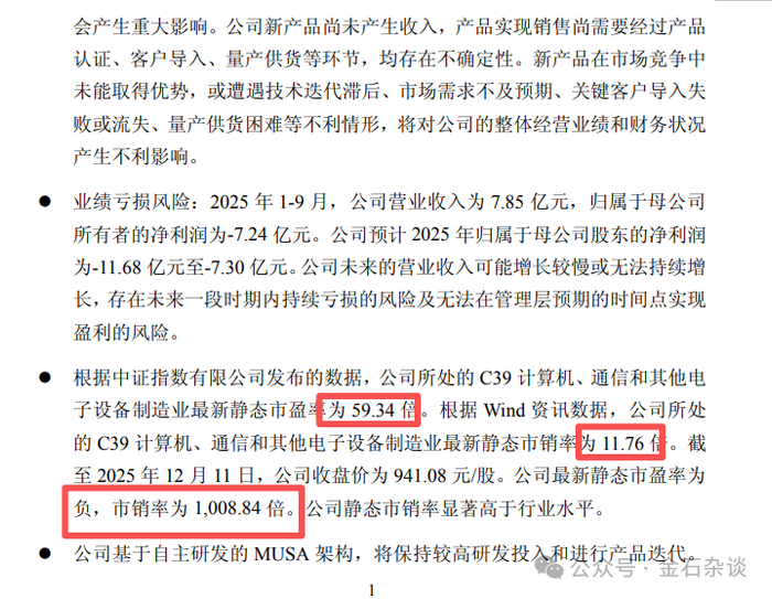 4)估值离谱,市销率高达1008倍。而同业中证指数行业静态市盈率59倍,wind同行业市销率11.76倍,摩尔直接是行业市销率的近100倍。