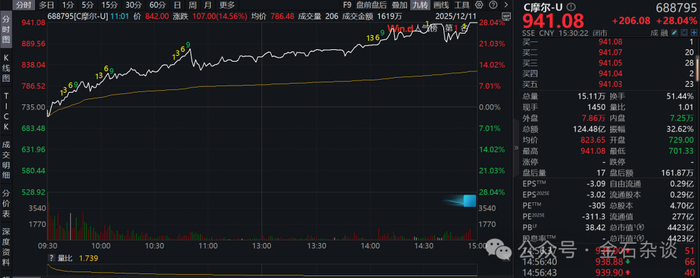 12月11日,国产GPU龙头摩尔线程继续狂飙,从114.28元的发行价一路狂飙,首日上市最高688元,如今再度突破700元、800元和900元,向1000元大关迈进。其中,有多大泡沫相信大家都知道。