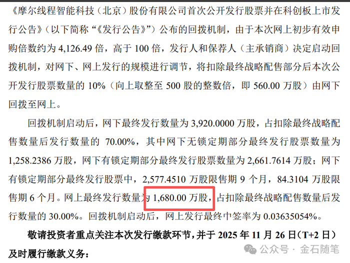 金石杂谈统计发现,摩尔上市前股东有4亿股,禁售;本次发行7000万股,战略配售1400万股;有触发回拨机制,网上配售1680万股,中签率低至0.036%;网下配售3920万,各大公募、私募(包括量化)、保险、券商、资管挤破头杀入。