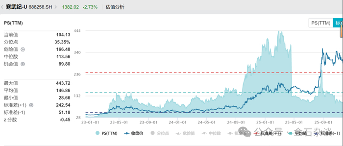 那一直有着“市概率来估值”说法的寒武纪,市销率又有多少呢?根据wind数据,寒武纪市销率104倍,最高也就是444倍,不及摩尔的1/2。目前市销率更是只有摩尔的1/10。因此,在资本圈,大家开始表示:寒武纪已经是老登股了。