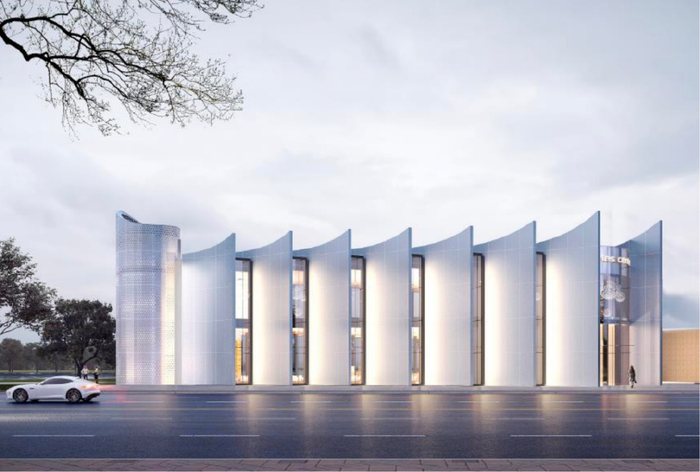 在建筑上,利用铝板和玻璃幕墙的超流体设计,打造社区乃至城市的地标级建筑。