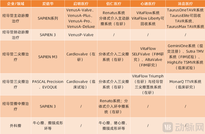 与爱德华相比,国内各企业的产品布局均不如其丰富,获批产品主要覆盖单一细分领域。如启明医疗、杰成医疗、沛嘉医疗、心通医疗、佰仁医疗、纽脉医疗等企业的主要商业化产品为TAVR产品;捍宇医疗、德晋医疗、汇禾医疗等企业的获批产品主要为经导管二尖瓣与三尖瓣治疗领域产品。