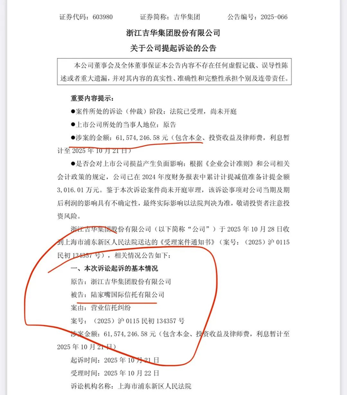 逾期三年!上市公司吉华集团起诉陆家嘴信托追讨6157万元!