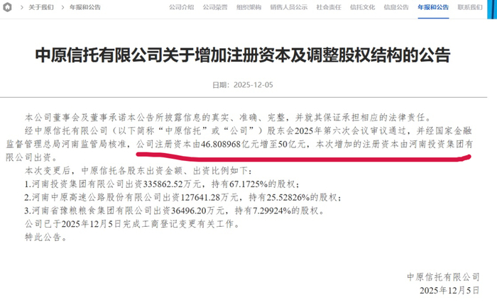 2025年12月5日,中原信托在官网挂出的一则公告,悄然完成了其注册资本从46.81亿元到50亿元的跃升——这3.19亿元的新增资本,最终由大股东河南投资集团“独力包揽”,
