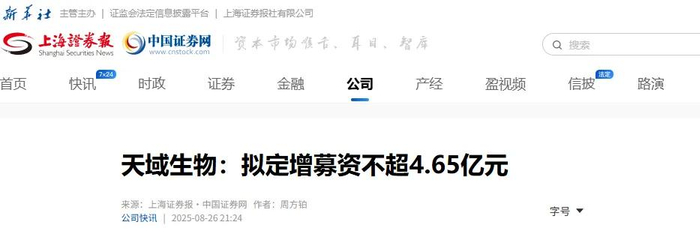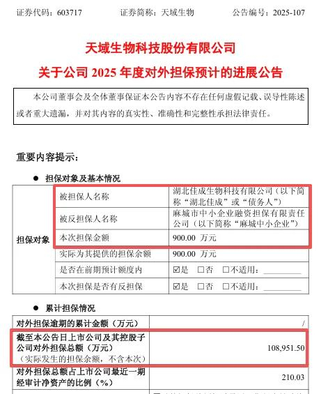 2025年11月21日,天域生物发布公司2025年度对外担保预计的进展公告。公告称,为子公司(湖北佳威)提供900万元担保,累计担保额已达10.90亿元。