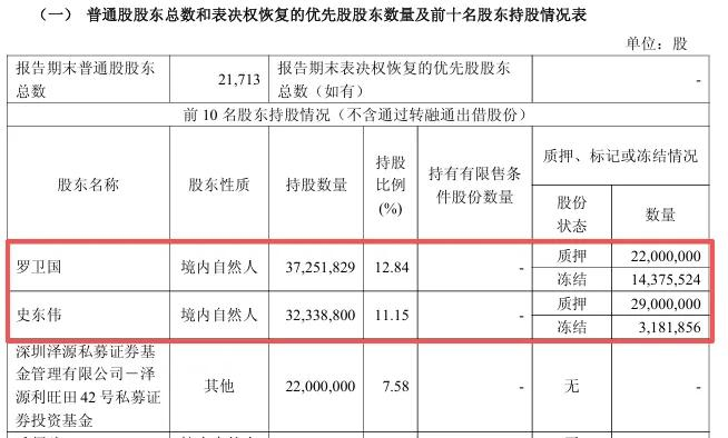 作为前10持股股东,罗卫国被质押2200万股,并有1437.55万股被冻结质押;而史东伟被质押2900万股,并有318.19万股被冻结。