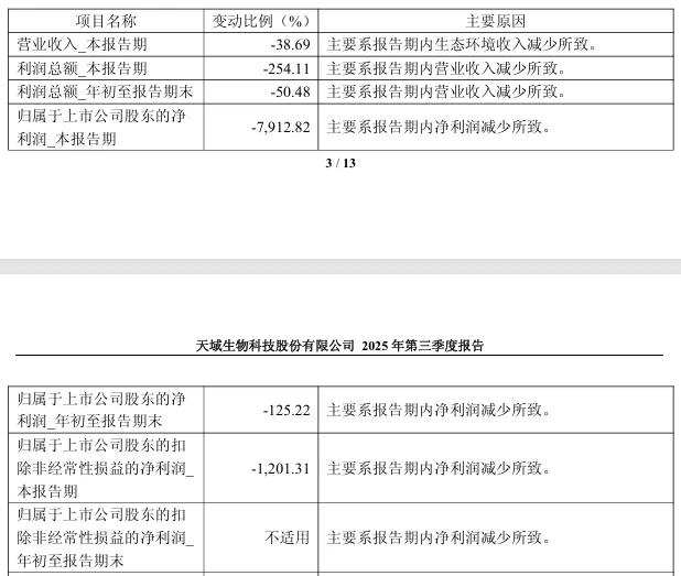 单看第三季度,天域生物营收为1.23亿元,同比下降38.69%;归母净利润为-1242.9万元,同比暴跌7912.82%;扣非净利润为-1485.61万元,同比暴跌1201.31%。