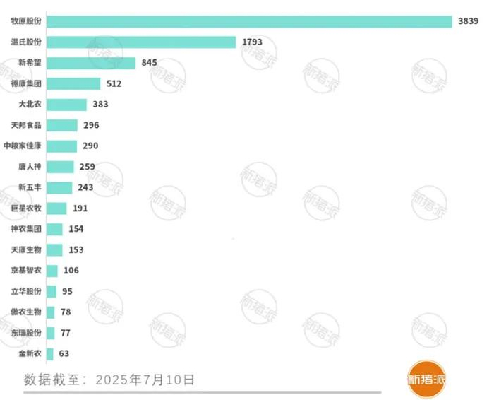 根据新猪派的数据,牧原股份和温氏股份生猪出栏量分别为3839万头和1793万头。