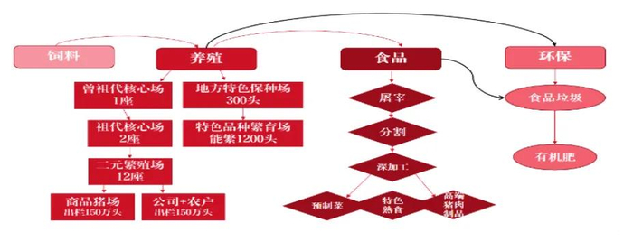通过产融结合、产研结合,打造成为集上游饲料加工、种猪育种、地方特色生猪品种保护与繁育;中游现代智能化规模养殖、特色生猪品种开发;下游生猪屠宰深加工、冷链物流、品牌猪肉营销及特色食品生产与销售于一体的“从源头到餐桌”的全产业链。
