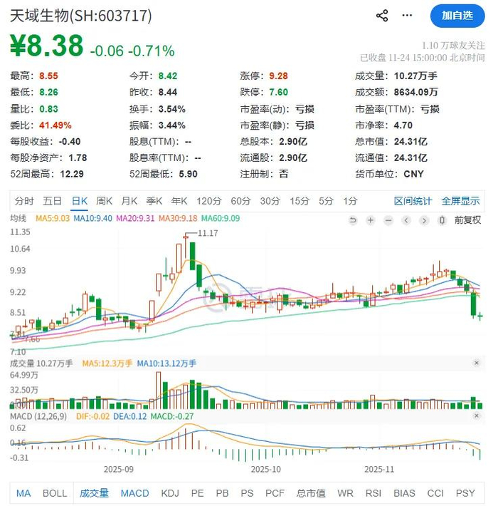 2025年11月21日,天域生物股价以8.33元/股跌停,涨幅为-9.95%,最终收盘价为8.44元/股。今日开盘同样走低,以8.38元/股收盘,换手率3.54%,总市值24.31亿元。
