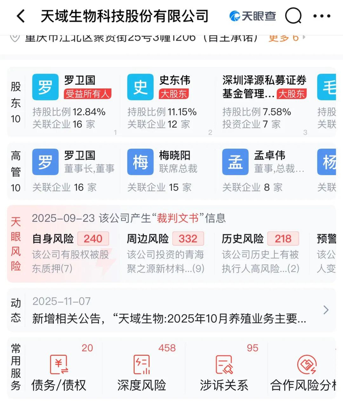 天眼查信息显示,天域生物目前自身风险达240条,周边风险332条,历史风险218条,深度风险458条,涉诉关系95条。