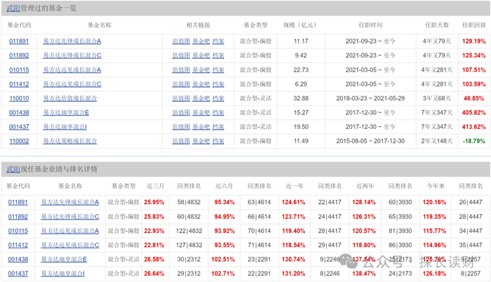 另外,易方达基金的武阳,现任基金也堪称“完美”。统计结果显示,武阳管理的3只基金(A/C基金算一只)为2025年准翻倍基,这3只基金也是武阳的全部现基金。已卸任的基金中,武阳管理的2只基金任职回报一正一负,其中任职为负的基金亏损不到20%,任职时间在10年前,也是武阳管理的首只基金。