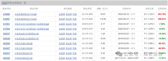 探长读财注意到,中航基金的韩浩一共管理过10只基金,其中任职回报为负的共6只,但任职亏损均未超过20%。作为韩浩的代表作——中航机遇领航混合发起A/C是韩浩任职回报最高、管理规模最大的基金。