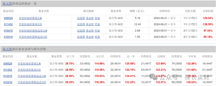与中航基金的韩浩、永赢基金的任桀相比,华泰柏瑞基金的陈文凯,任职回报、阶段涨幅都堪称“完美”,但陈文凯累计从业年限只有2年又131天,管理过的基金也只有4只,很难说这不是幸存者偏差,期待陈文凯能“完美”的时间更长。