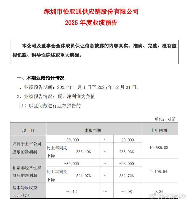 2025年度业绩预告显示,怡亚通2025年归母净利润预计在-3亿元至-2亿元之间,同比下降288.93%至383.40%;预计扣非净利润在-3.9亿元至-2.6亿元之间,同比下降382.72%至524.07%。