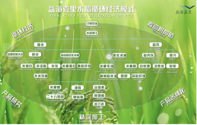 看看下图,大体意思就是一点不浪费,“垃圾”有“垃圾”的用法,总之要将水稻、大豆、玉米、小麦等农产品的资源价值“吃干榨净”,比如水稻的稻壳可以利用来发电,稻壳灰又可以提取出白炭黑、活性炭,米糠则可以用来榨取高营养价值的米糠油和米糠粕……