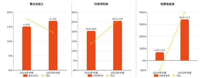 公司营业总收入为5.14亿元,较去年同报告期营业总收入增加5935.51万元,实现2年连续上涨,同比较去年同期上涨13.05%。归母净利润为5675.19万元,较去年同报告期归母净利润增加1155.30万元,实现2年连续上涨,同比较去年同期上涨25.56%。经营活动现金净流入为5969.71万元,较去年同报告期经营活动现金净流入增加4772.25万元,同比较去年同期上涨398.53%。
