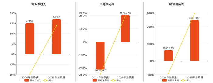 公司营业总收入为5.19亿元。归母净利润为2576.27万元。经营活动现金净流入为7394.33万元。