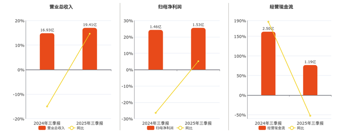 公司营业总收入为19.41亿元。归母净利润为1.53亿元。经营活动现金净流入为1.19亿元,较去年同报告期经营活动现金净流入减少1.31亿元,同比较去年同期下降52.58%。