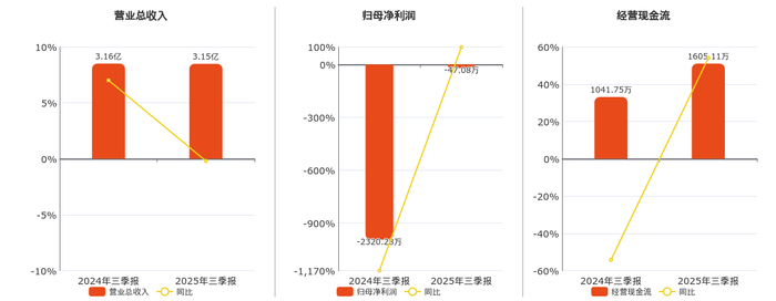 公司营业总收入为3.15亿元,较去年同报告期营业总收入减少64.15万元,同比较去年同期下降0.20%。归母净利润为-47.08万元。经营活动现金净流入为1605.11万元。
