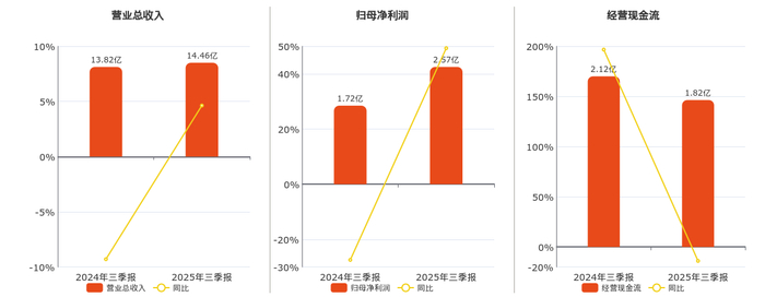 公司营业总收入为14.46亿元。归母净利润为2.57亿元。经营活动现金净流入为1.82亿元,较去年同报告期经营活动现金净流入减少2947.60万元,同比较去年同期下降13.91%。