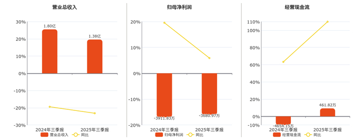 公司营业总收入为1.38亿元,较去年同报告期营业总收入减少4166.37万元,同比较去年同期下降23.19%。归母净利润为-3680.97万元。经营活动现金净流入为461.82万元。