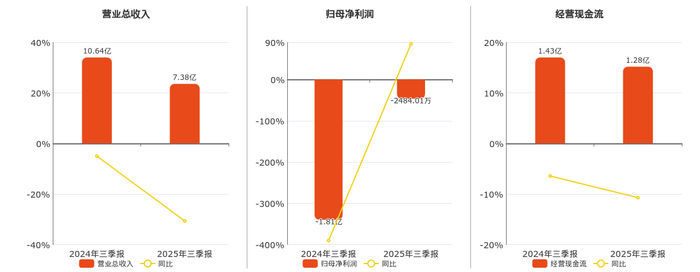 公司营业总收入为7.38亿元,在已披露的同业公司中排名第4。归母净利润为-2484.01万元,较去年同报告期归母净利润增加1.56亿元。经营活动现金净流入为1.28亿元。