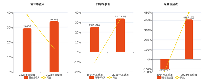 公司营业总收入为16.02亿元,在已披露的同业公司中排名第3,较去年同报告期营业总收入增加2.16亿元,实现2年连续上涨,同比较去年同期上涨15.63%。归母净利润为7965.45万元,在已披露的同业公司中排名第3,较去年同报告期归母净利润增加1996.22万元,同比较去年同期上涨33.44%。经营活动现金净流入为8495.13万元,在已披露的同业公司中排名第4,较去年同报告期经营活动现金净流入增加1.07亿元。