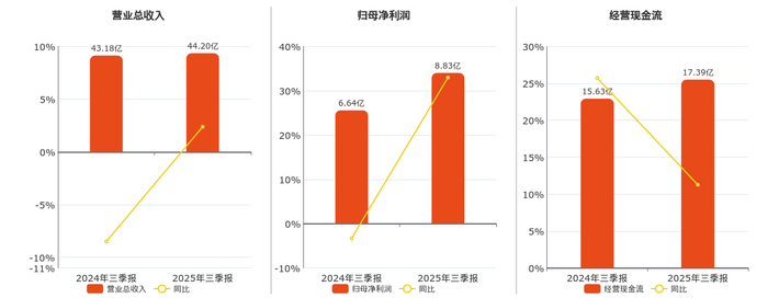 公司营业总收入为44.20亿元,在已披露的同业公司中排名第10,较去年同报告期营业总收入增加1.03亿元,同比较去年同期上涨2.38%。归母净利润为8.83亿元,在已披露的同业公司中排名第6,较去年同报告期归母净利润增加2.19亿元,同比较去年同期上涨32.97%。经营活动现金净流入为17.39亿元,在已披露的同业公司中排名第4,较去年同报告期经营活动现金净流入增加1.76亿元,实现2年连续上涨,同比较去年同期上涨11.26%。
