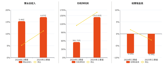 公司营业总收入为6.07亿元。归母净利润为1312.83万元。经营活动现金净流入为-2.26亿元,在已披露的同业公司中排名第95,较去年同报告期经营活动现金净流入减少579.61万元。
