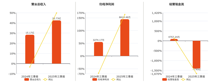公司营业总收入为22.73亿元。归母净利润为8614.46万元。经营活动现金净流入为-7.45亿元,在已披露的同业公司中排名第100,较去年同报告期经营活动现金净流入减少7.92亿元,同比较去年同期下降1665.12%。