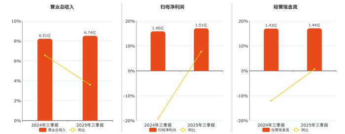 公司营业总收入为6.74亿元,在已披露的同业公司中排名第51。归母净利润为1.51亿元。经营活动现金净流入为1.44亿元。