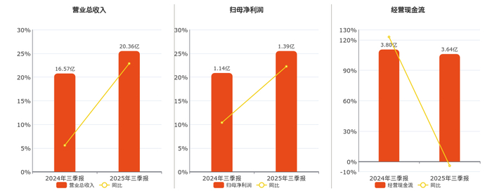 公司营业总收入为20.36亿元。归母净利润为1.39亿元。经营活动现金净流入为3.64亿元,较去年同报告期经营活动现金净流入减少1533.41万元,同比较去年同期下降4.04%。