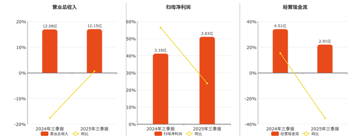 公司营业总收入为12.15亿元。归母净利润为3.83亿元。经营活动现金净流入为2.91亿元,较去年同报告期经营活动现金净流入减少1.59亿元,同比较去年同期下降35.36%。