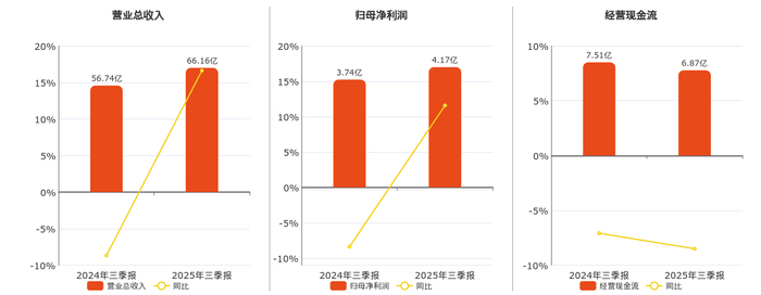 公司营业总收入为66.16亿元,在已披露的同业公司中排名第30,较去年同报告期营业总收入增加9.43亿元,同比较去年同期上涨16.62%。归母净利润为4.17亿元,在已披露的同业公司中排名第35,较去年同报告期归母净利润增加4327.53万元,同比较去年同期上涨11.58%。经营活动现金净流入为6.87亿元,在已披露的同业公司中排名第24。