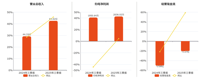 公司营业总收入为64.62亿元。归母净利润为2036.02万元,在已披露的同业公司中排名第15。经营活动现金净流入为-1.27亿元,在已披露的同业公司中排名第21。